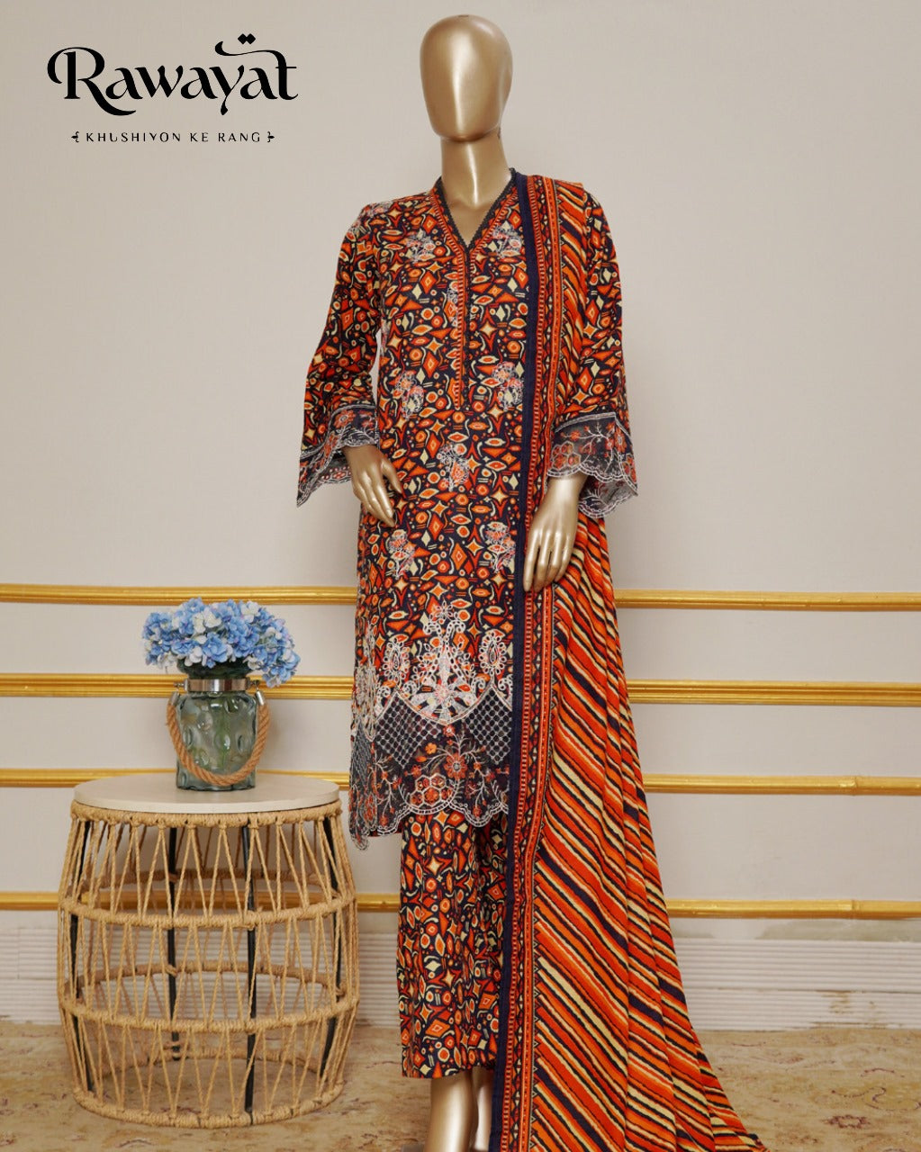 3 Piece  DFRNT  Color Embroidered Khaddar Stitched Suit with Khaddar Dupatta and Printed Trouser