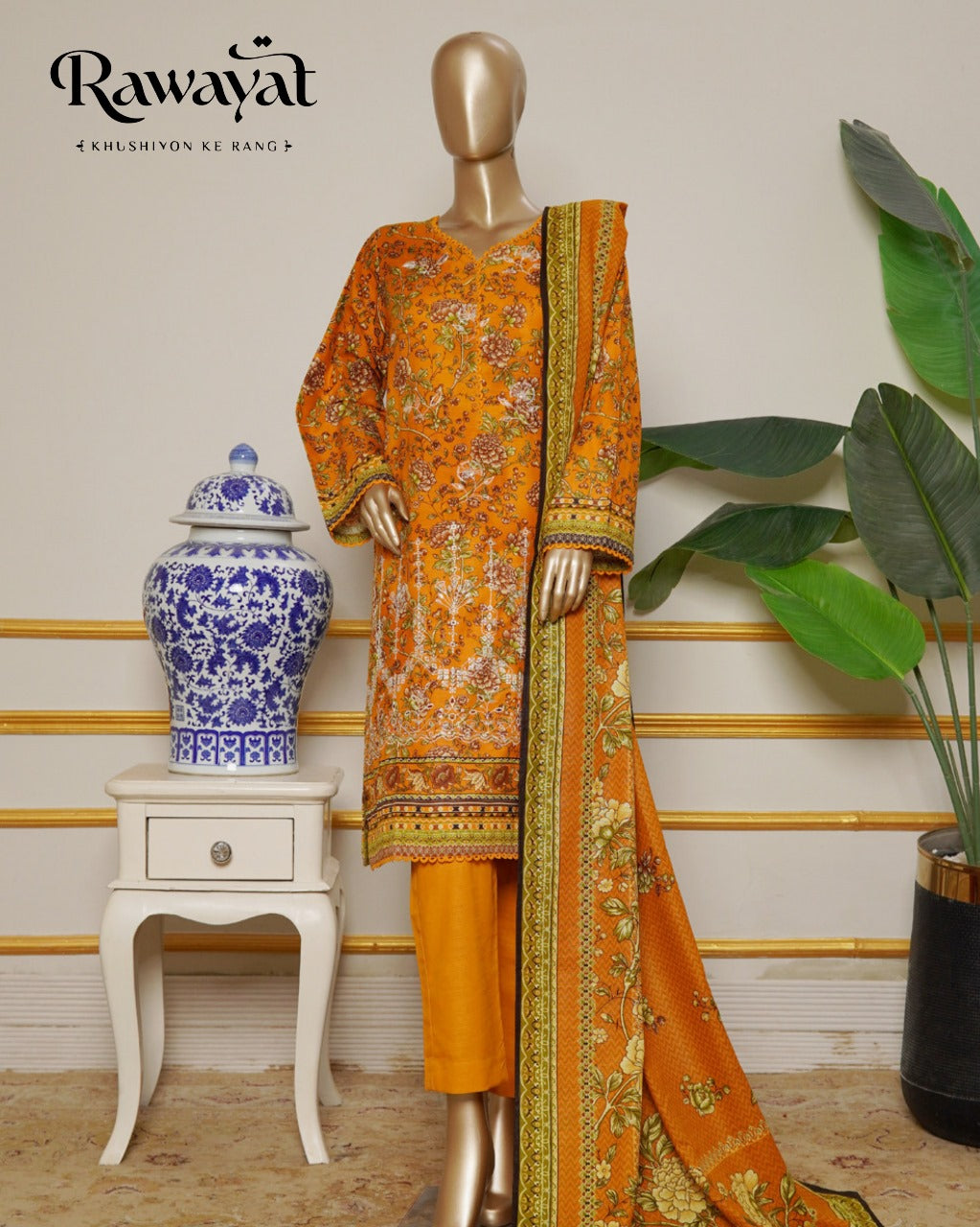 3 Piece  DFRNT  Color Embroidered Khaddar Stitched Suit with Khaddar Dupatta and Printed Trouser