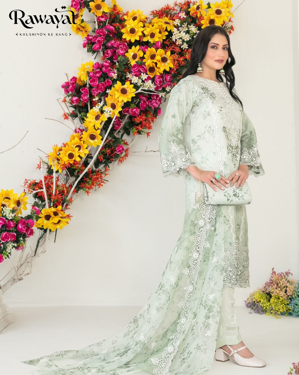 3 Piece Stitched Collection By Rawayat Fabrics, Attractive & Elegant Organza Collection comes with: