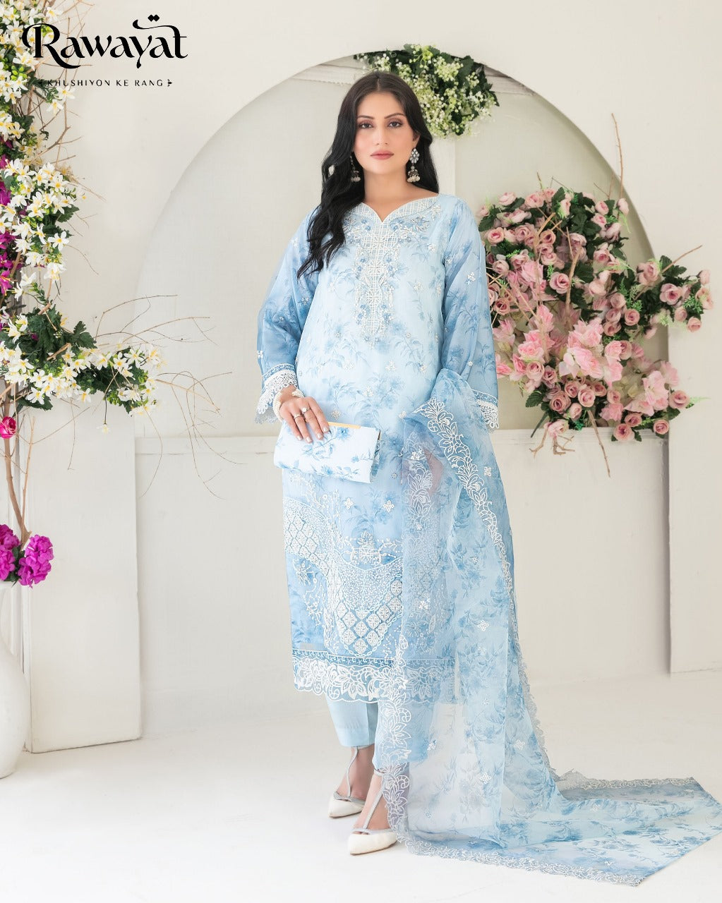 3 Piece Stitched Collection By Rawayat Fabrics, Attractive & Elegant Organza Collection comes with: