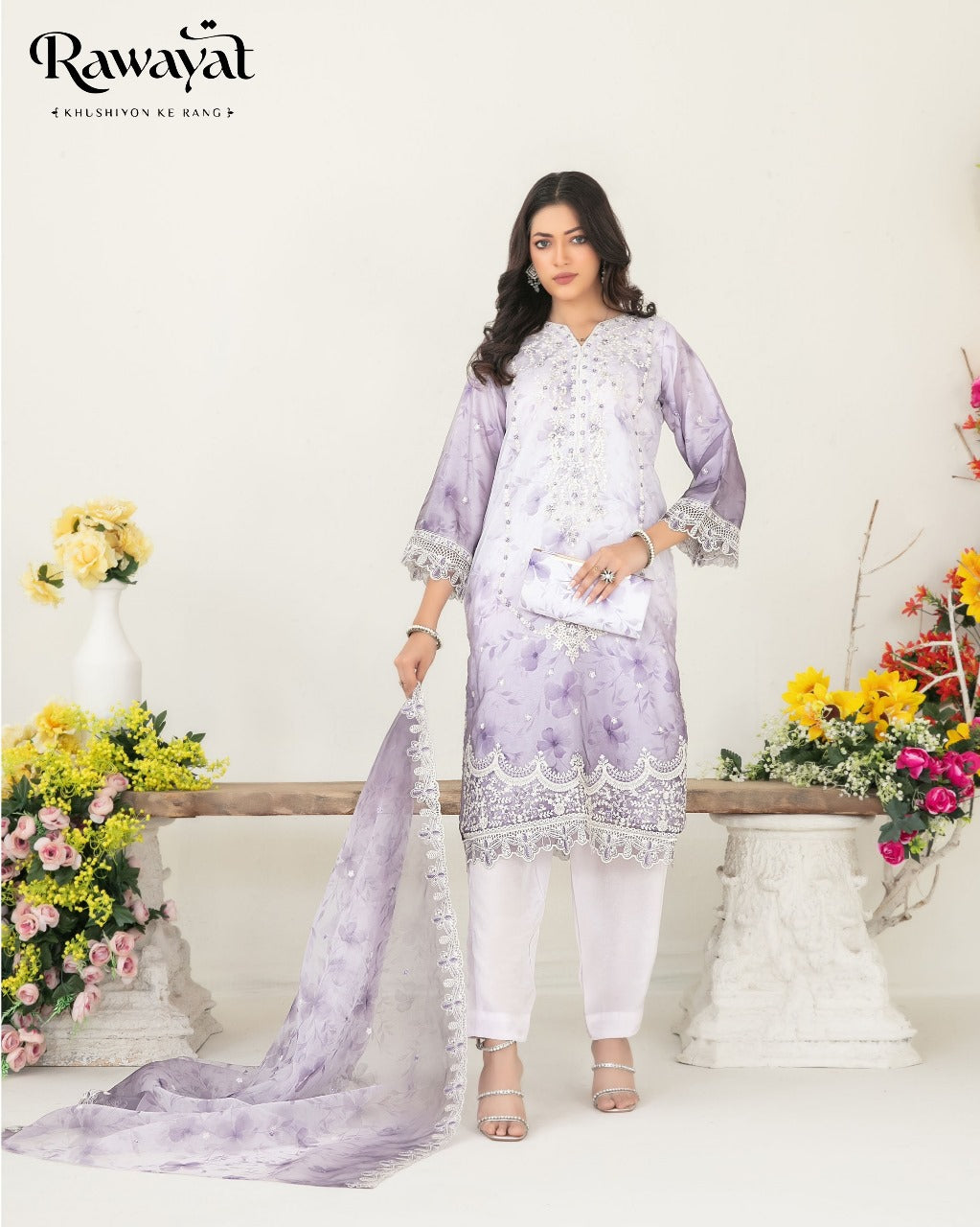 3 Piece Stitched Collection By Rawayat Fabrics, Attractive & Elegant Organza Collection comes with: