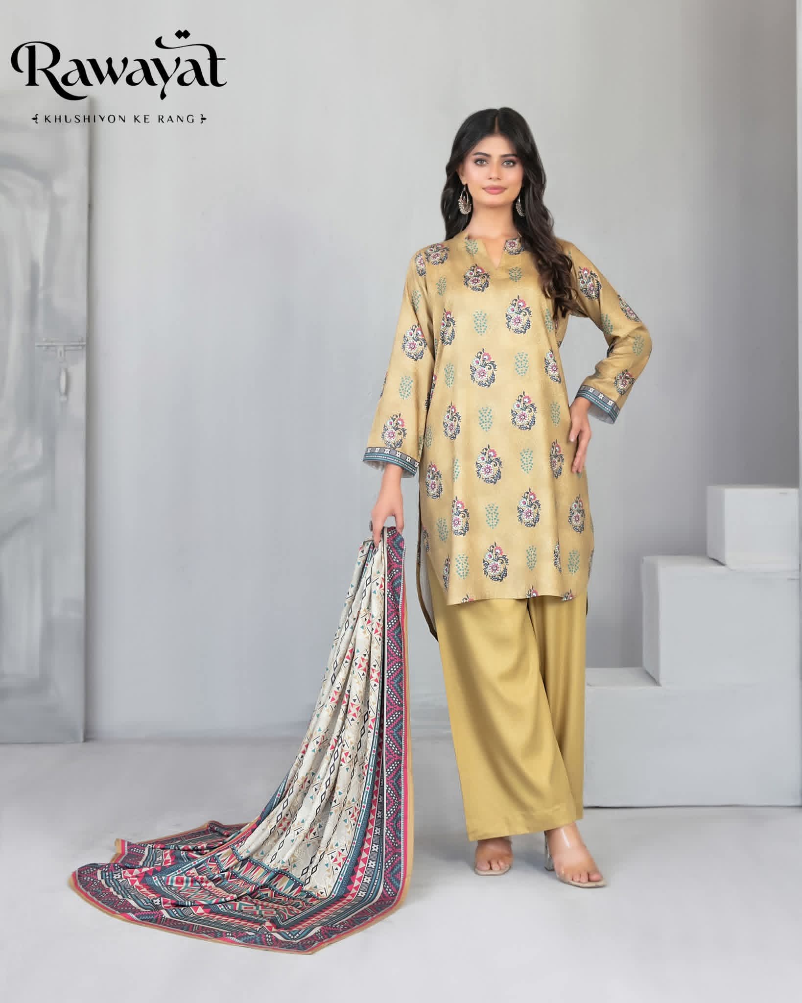 3 Piece Un-Stitched Collection By Rawayat Fabrics, Attractive & Elegant  Twil Collection comes with: