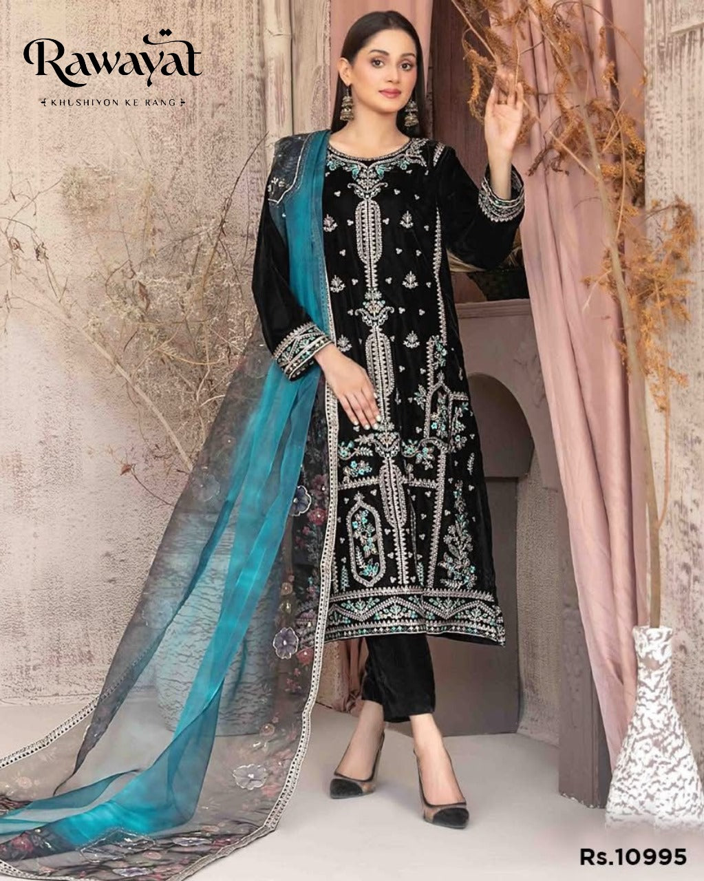 3 Piece Stitched Collection By Rawayat Fabrics, Attractive & Elegant Fancy Embroidered Velvet Collection comes with: