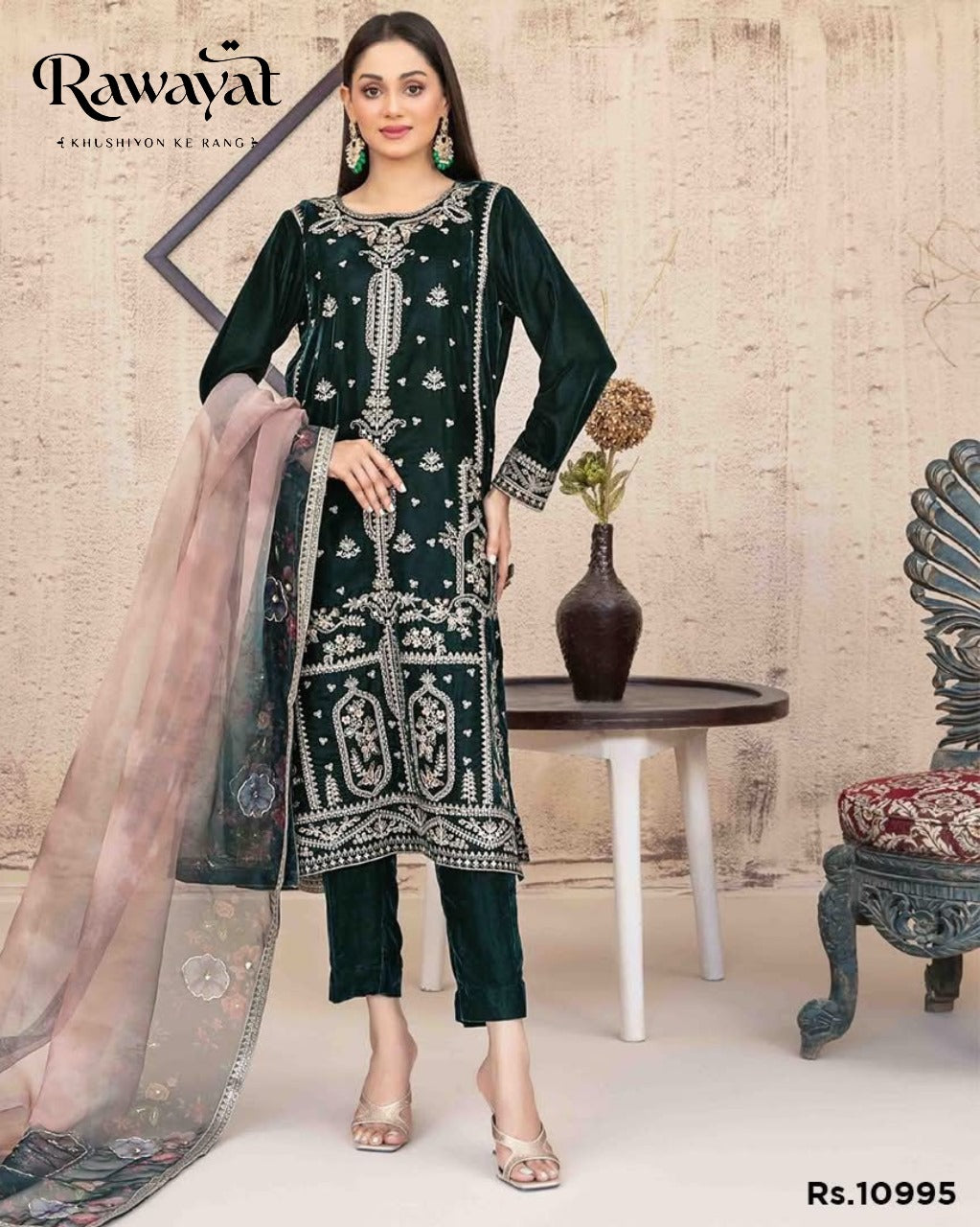 3 Piece Stitched Collection By Rawayat Fabrics, Attractive & Elegant Fancy Embroidered Velvet Collection comes with: