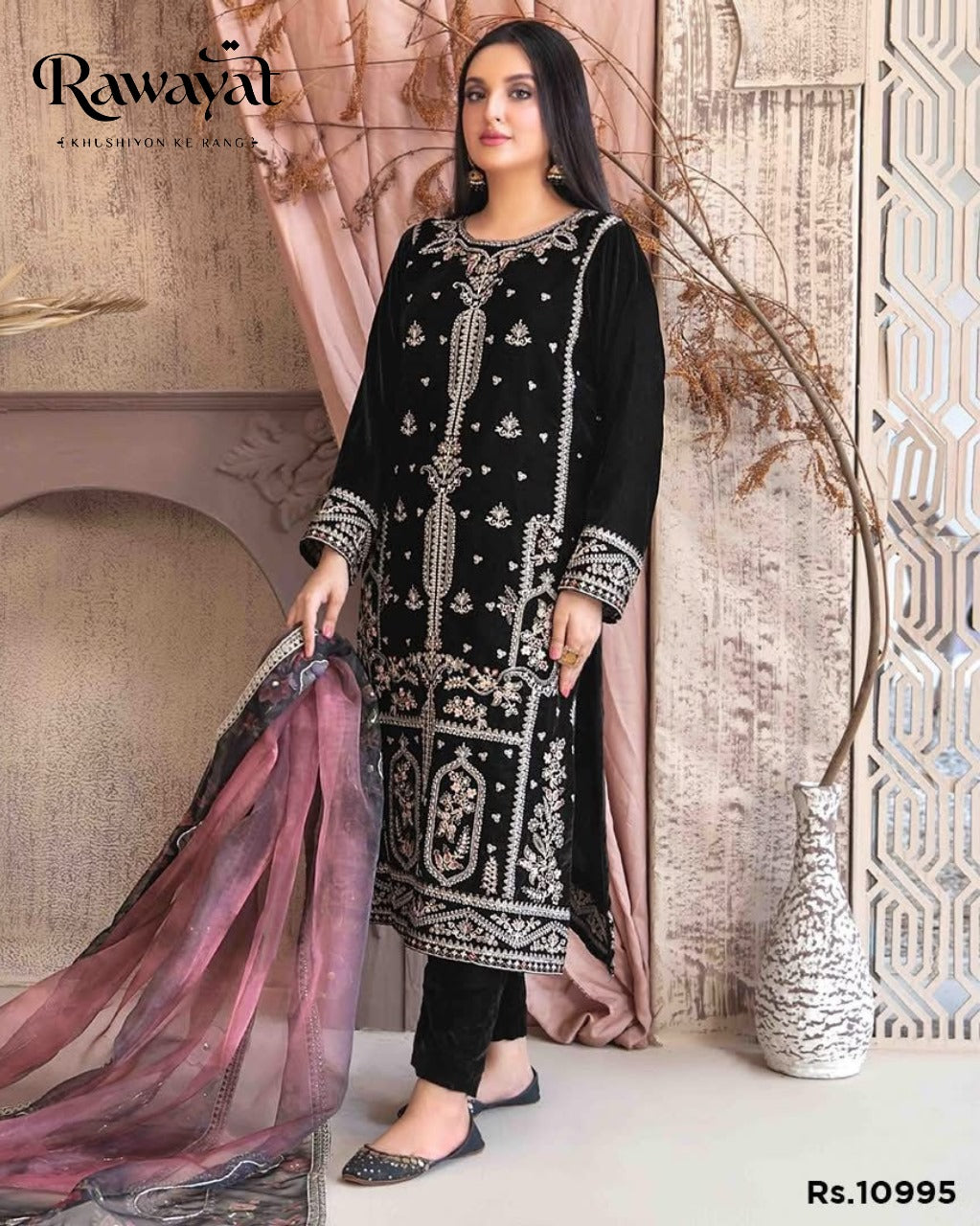 3 Piece Stitched Collection By Rawayat Fabrics, Attractive & Elegant Fancy Embroidered Velvet Collection comes with: