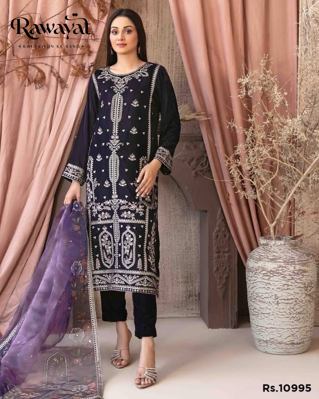 3 Piece Stitched Collection By Rawayat Fabrics, Attractive & Elegant Fancy Embroidered Velvet Collection comes with: