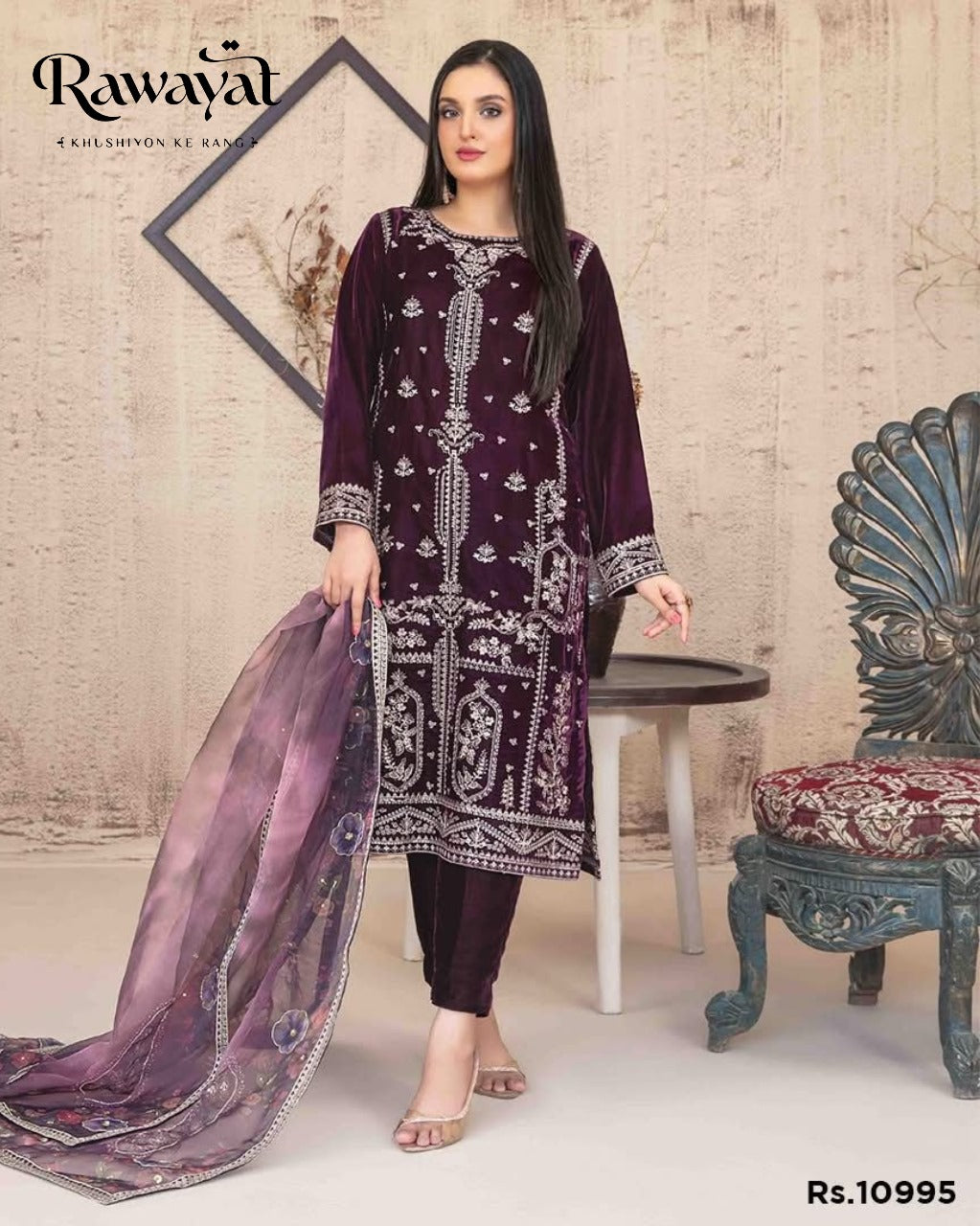 3 Piece Stitched Collection By Rawayat Fabrics, Attractive & Elegant Fancy Embroidered Velvet Collection comes with: