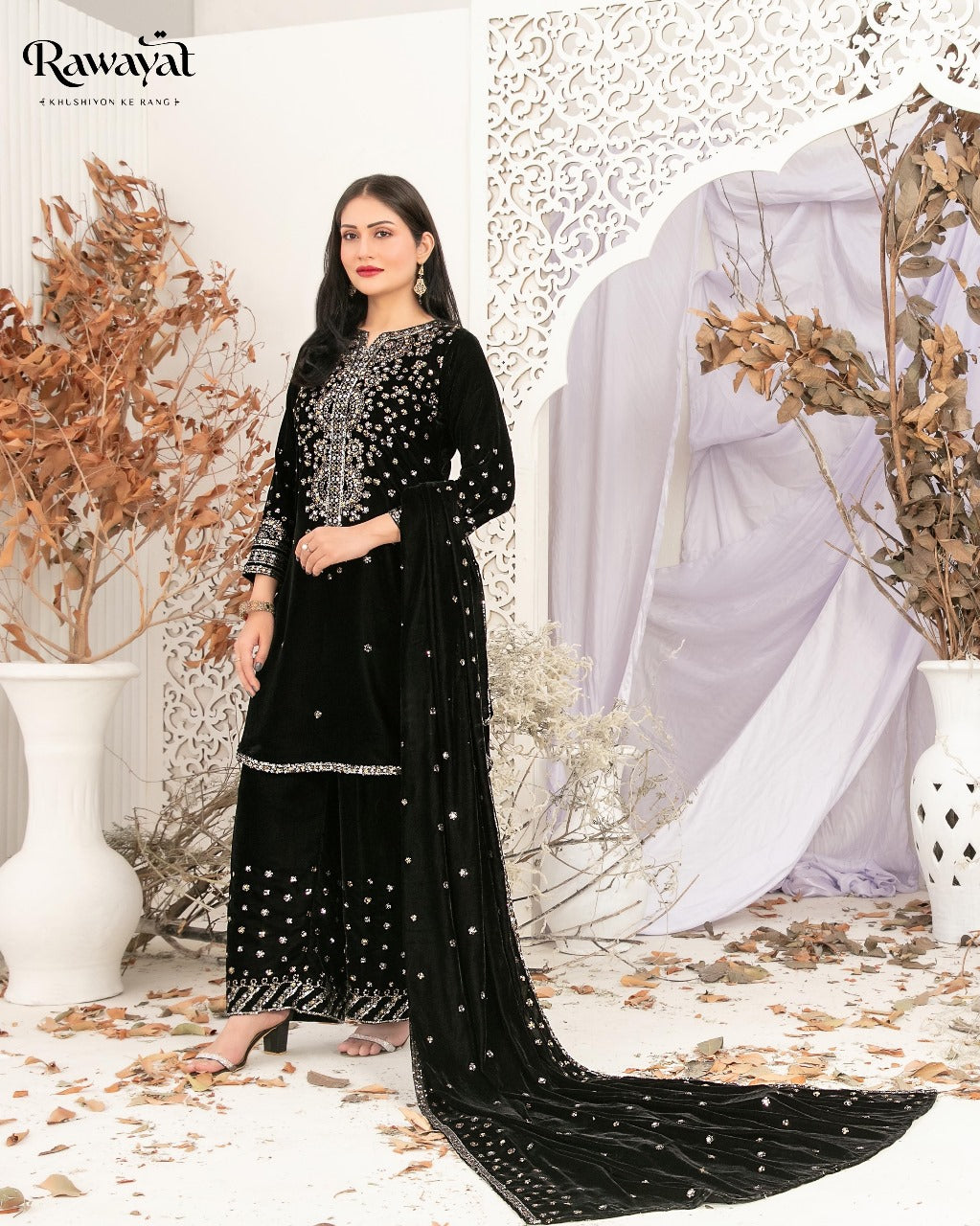 3 Piece Un-Stitched Collection By Rawayat Fabrics, Attractive & Elegant Velvet Collection comes with: