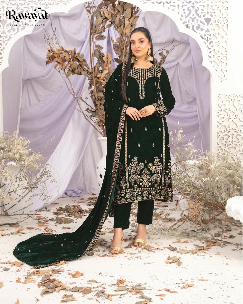 3 Piece Un-Stitched Collection By Rawayat Fabrics, Attractive & Elegant Velvet Collection comes with: