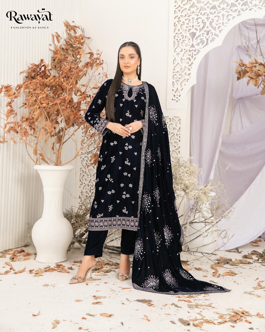 3 Piece Un-Stitched Collection By Rawayat Fabrics, Attractive & Elegant Velvet Collection comes with: